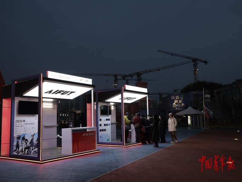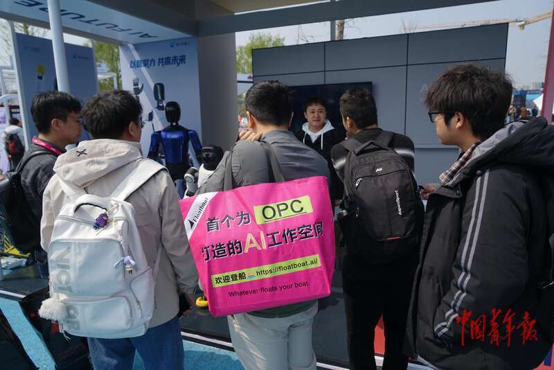 4月8日,北京亦庄,入夜后,一家AI应用的展台旁还围着许多年轻人。中青报·中青网记者 李强/摄