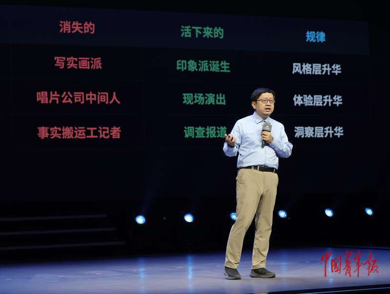 4月9日,北京亦庄,昆仑万维董事长兼CEO方汉参加“AI未来大会”并分享,他认为未来有五种人不会被AI取代,其中从事调查报道的记者也属于会“活下来的”。中青报·中青网记者 李强/摄