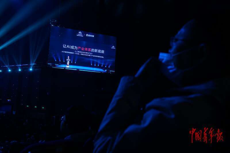4月8日,北京亦庄,台下观众在观看北京经济技术开发区(北京亦庄)工委副书记、管委会主任王磊在大会上致辞。据了解,北京亦庄正在推进“全域人工智能之城”的建设。中青报·中青网记者 李强/摄