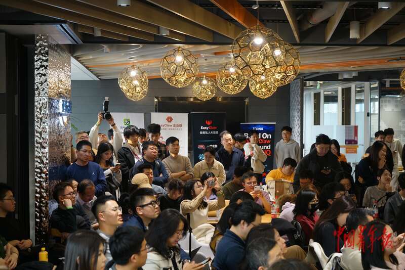 3月7日,北京朝阳,一场“龙虾进化大会”上,许多年轻人正站着听会。这场大会报名人数超过千人,仅100余人获得参会名额,来得晚的参会者只能站着旁听。中青报·中青网记者 李强/摄