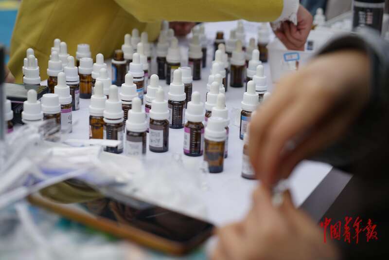 4月9日,北京亦庄,一个年轻人利用AI推出了“AI调香”项目,参与者与AI对话,AI会将对话者输入的信息解析成香料配方,现场进行调制。中青报·中青网记者 李强/摄