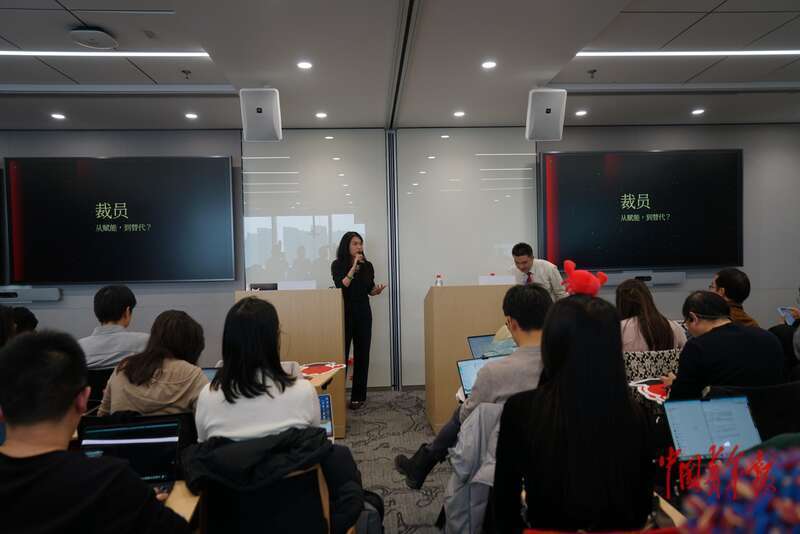 3月7日,北京朝阳,“龙虾进化大会”上,一位分享者谈及AI时代的裁员问题。中青报·中青网记者 李强/摄