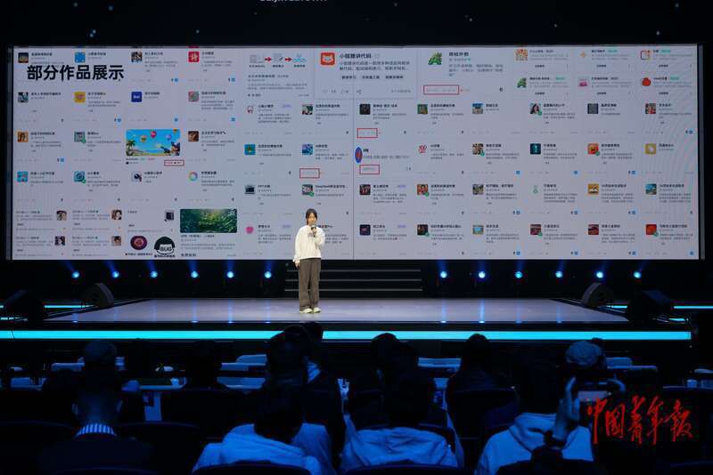 4月9日,北京亦庄,13岁的独立开发者吕思彤在“AI未来大会”上分享自己开发的诸多产品。中青报·中青网记者 李强/摄