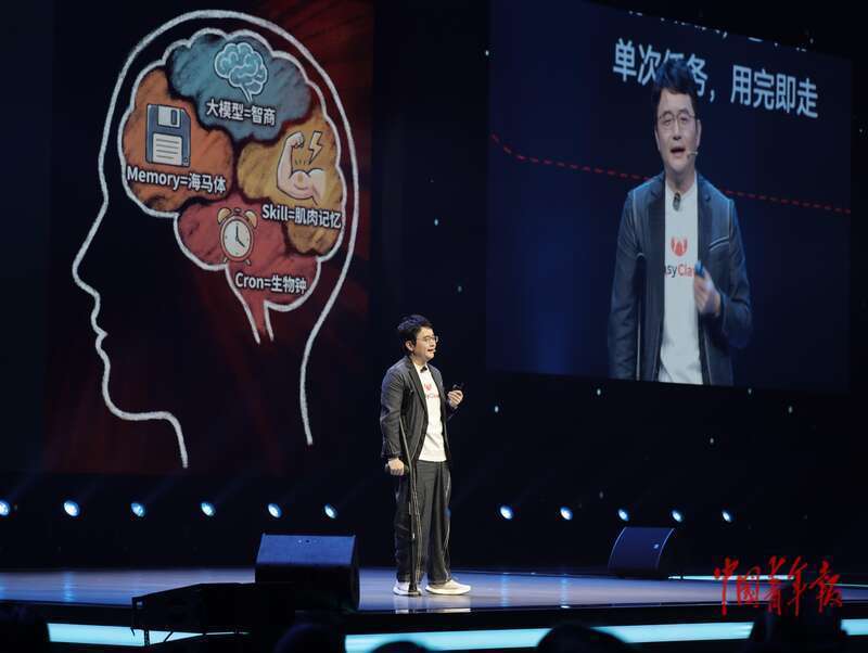4月8日,北京亦庄,被网友调侃为“中国龙虾大使”的猎豹移动董事长兼CEO傅盛在“AI未来大会”分享“养虾”心得。他把自己养“龙虾”的经历分享在社交平台上,收获了许多网友的关注。中青报·中青网记者 李强/摄