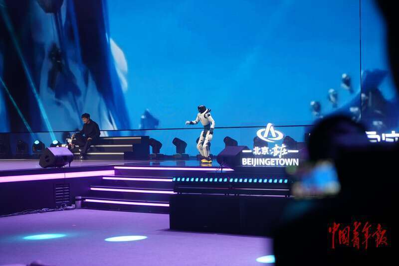 4月8日,北京亦庄,一台人形机器人与一位AI音乐艺人同台表演。中青报·中青网记者 李强/摄