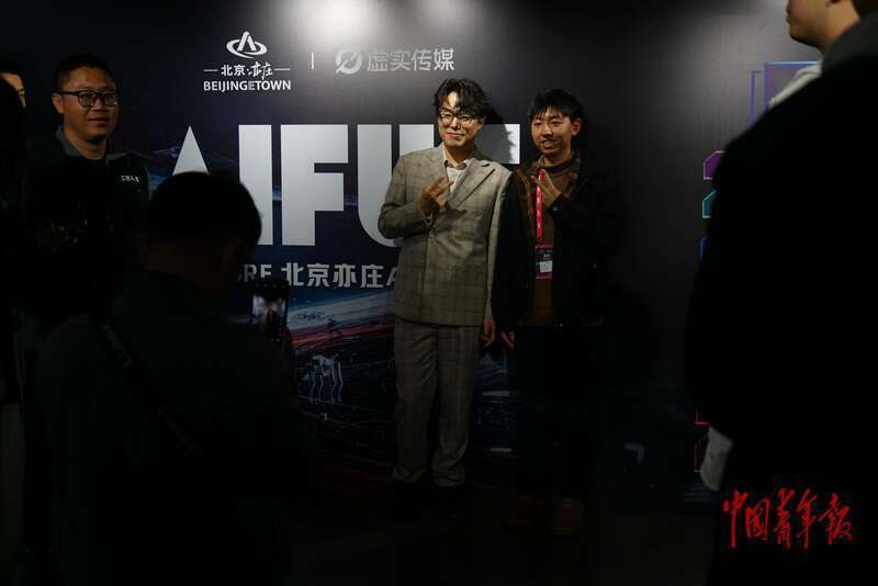 4月9日,北京亦庄,“AI未来大会”结束后,大会主办者、知名AI自媒体博主张仁杰(左)被许多年轻人围着求合影,他是一名95后。中青报·中青网记者 李强/摄