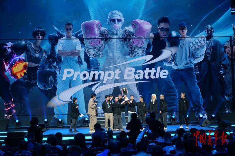 4月9日,北京亦庄,AI未来大会上举办了一场“AI电竞大赛”,参赛者进行了AI视频生成竞赛。赛后,两支队伍共同举起奖杯。中青报·中青网记者 李强/摄